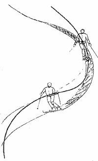 よく大きなターンをするときに「斜滑降が問延びし、次のターンまで何をしてよいか分からない!」と言うことがよく聞かれます。それはターンで急激に曲げすぎて斜滑降が長くなりすぎるためです。ターンとターンをつなぐ斜滑降ではターンドライブを正確に作り、少しでも短くもっていくことが重要です。