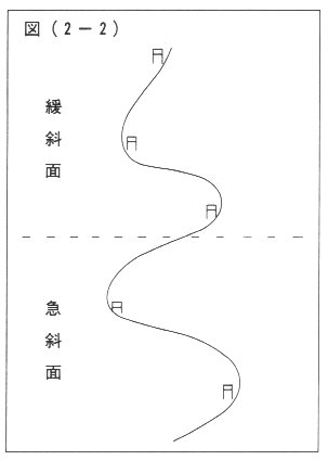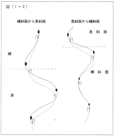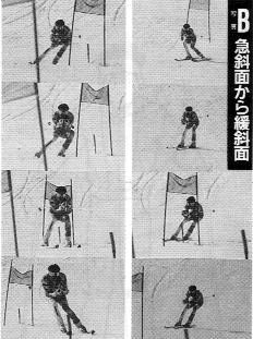 緩斜面から急斜面の場合は、緩斜面のセットの構成で、急斜面の1~2手前のライン取りをよく見て、このセットをアウトからインにライン取りし、急斜面にスムーズに入るようにしてください。